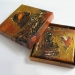 Dit kunstdoosje is speciaal gemaakt voor een trouwerij. Als kadeautje zat er geld en een kaartje in. Op de voorkant staat de trouwdatum. Het doosje is eerst versierd met allerlei materialen zoals teer, zand, schelpen, draad en zaagsel. Het doosje is beschilderd met acryl verf.