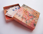 2011Kunstdoosje met een doekje erin. Gemaakt van houtbord, versierd met allerlei materialen en daarna beschilderd met acrylverf. Gebruikte materialen: o.a. teer, houtlijm, stof, papier en draad. Afgewerkt met jachtlak voor een zeer glimmend resultaat.